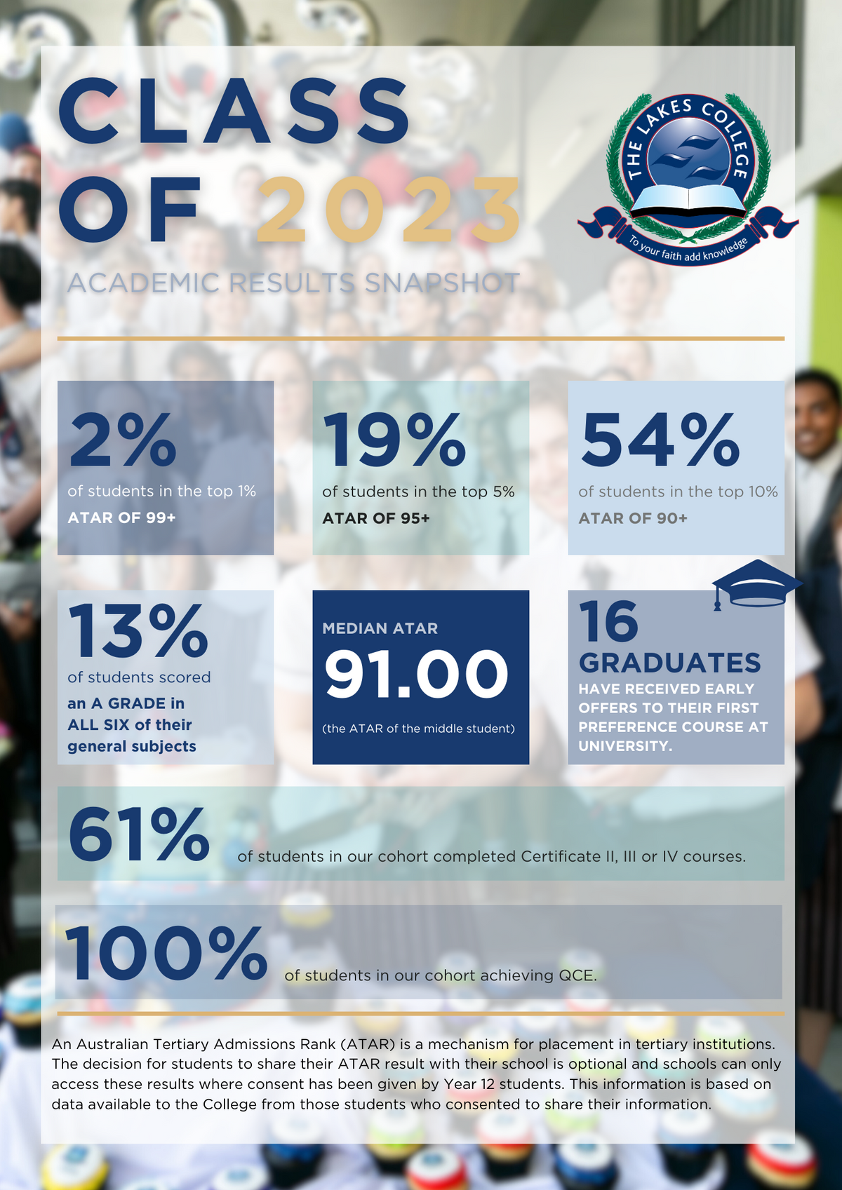 - 2% of our eligible students achieved an ATAR of 99 and above, an outstanding accomplishment placing them in the top 1% of the state