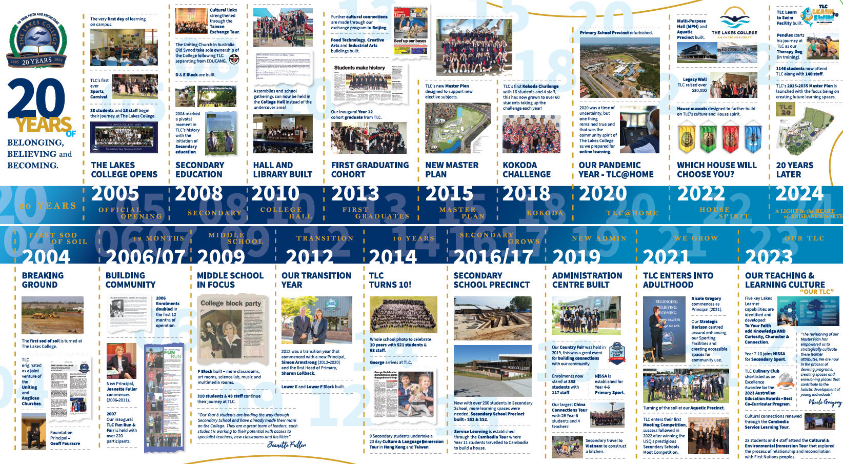 The Uniting Church in Australia Qld Synod also took sole ownership of the College in 2008. A significant moment in our history, where The Lakes College separated from EDUCANG Ltd and established its' own Board. While the ownership of The Lakes College was to be vested in the Uniting Church in Australia, Qld Synod, the College continued to provide an ecumenical education for their students by continuing to have a close professional relationship with Forest Lake College and The Springfield College.
